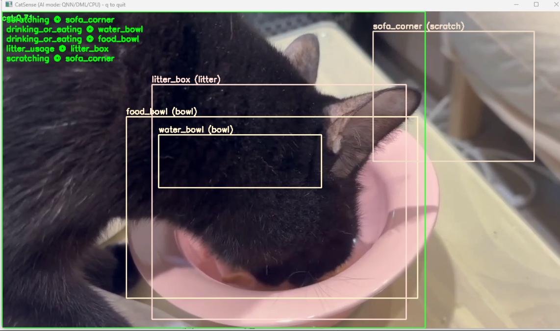 解法:在 Snapdragon X 系列筆電本地推論(比賽方要求,因為我沒進到決賽所以實際的運行皆在我的ASUS筆電內),偵測「貓」+判斷行為(吃飯、喝水、睡覺、梳理、抓沙發、跳上桌、進出貓砂、激烈打鬧…),即時提醒與日誌統計。